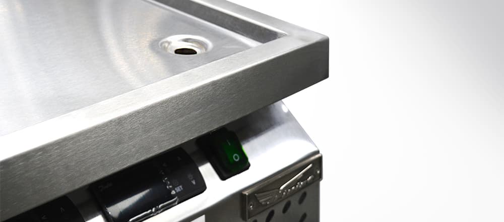 Новая усовершенствованная столешница с утопленными бортами по всему периметру предотвращает стекание конденсата на пол или по холодильному столу. Для слива жидкости в углу стола имеется дренажное отверстие, которое направляет конденсат в специальный лоток.
